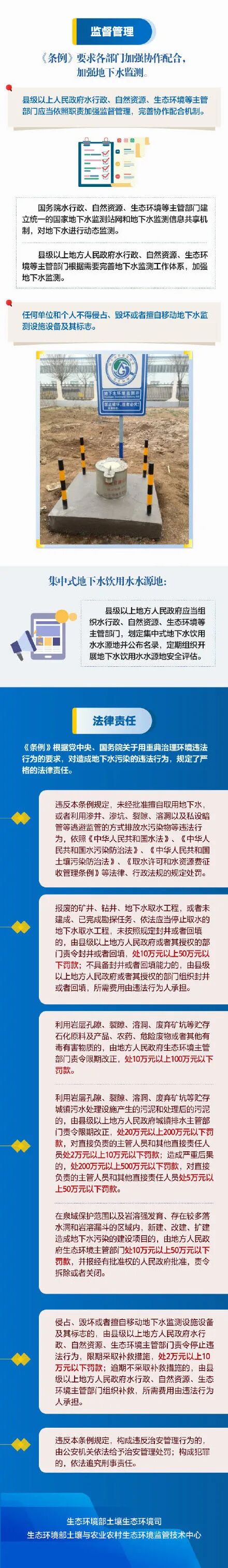 五是强监督管理。加强地下水监测站网和监测信息共享机制建设。对违反《条例》的行为设定严格的法律责任,强化责任追究。