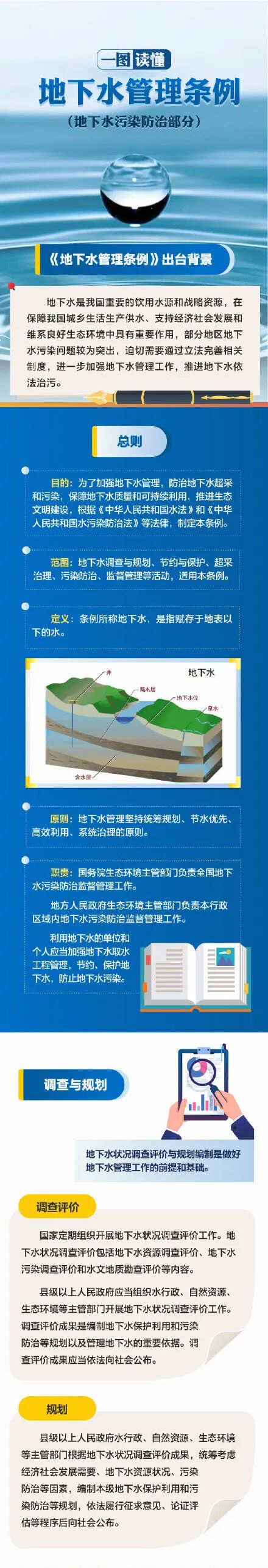 一是规范地下水状况调查评价与规划编制。县级以上人民政府应当开展地下水状况调查评价工作,编制本级地下水保护利用和污染防治等规划。